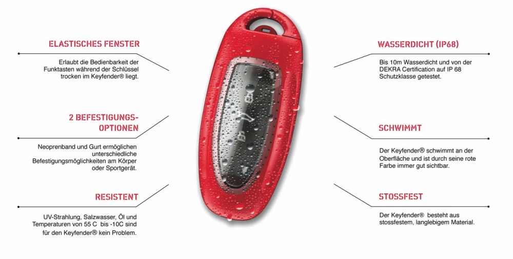 Der neue Keyfender ist dein ultimativer Schlüsselsafe fürs Wasser. Dank des wasserdichten Hard Cover muss der Schlüssel nich mehr am Strand vergraben oder in den Radkasten gelegt werden. Den Keyfender nimmst du einfach mit aufs und ins Wasser. UV-, Salzwasser- und Ölresistent ist dein elektronischer Schlüssel sicher und trocken verpackt und kann dank des Gummifensters Problemlos bedient werden ohne den Keyfender selber öffnen zu müssen. Das ersparrt so manchen Stress wenn man mal die Handschuhe im Auto vergessen oder seinen Snack rausholen möchte.
