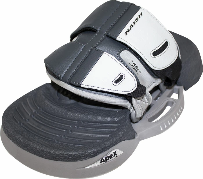 Die neue Naish Apex Bindung zählt zu den fortschrittlichsten Bindungen auf dem Markt. Dank der festen Kombination aus Baseplate und Strap ist sie auf nahezu jedes Twin Tip montierbar. Der Strap lässt sich dank der 4-Punkt Fixierung perfekt an die verschiedensten Fußformen anpassen. Das Fußbett ist ergonomisch geformt und mit verschiedenen Schaumzonen ausgestattet. Der Bereich am Haken kann je nach Bedarf hart oder weich eingestellt werden. Dazu wechselt man einfach die mitgelieferten Infill Pads.