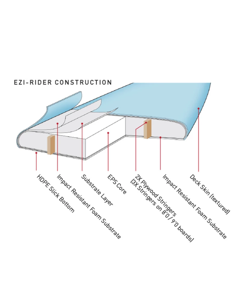 - EPS Core – Wasserfest und leicht. Ein dreifacher Stringer erhöht die steifigkeit des Boards und hält den Rocker auch bei starker Beansruchung