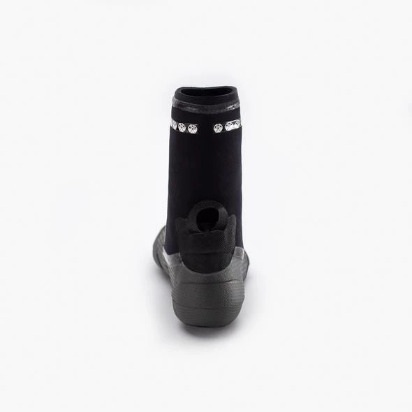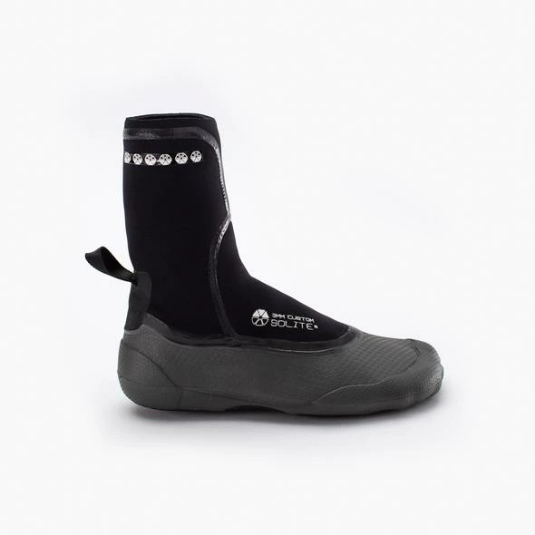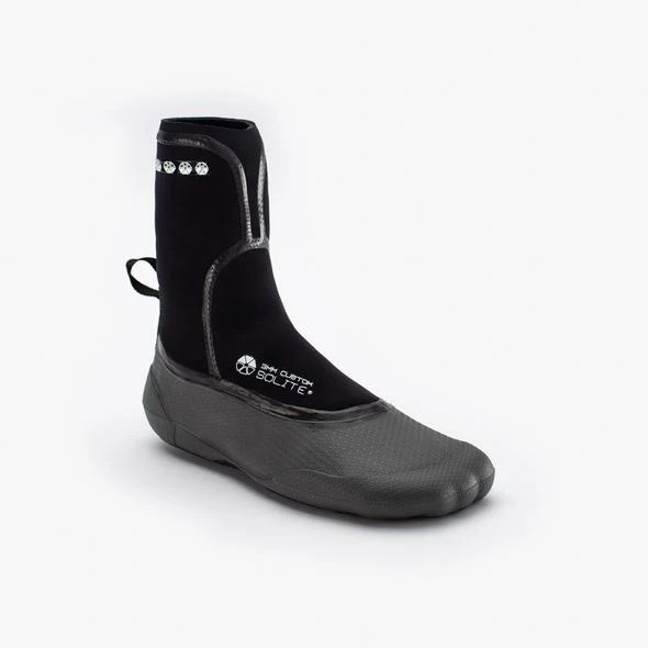 Die Ausstattung und Verarbeitung des 3mm Solite Custom Boot sind enorm. Der untere, thermisch anpassbare Teil ist aus einem Stück gefertig und zusammen mit den 1mm aufvulkanisierten Gummisohlen super stabil und zugleich extrem warm und flexibel. Für einen leichten Einstieg ist der Schuh mit einem Heelstrap ausgetattet. Sämtliche Außennähte sind flüssigverklebt.